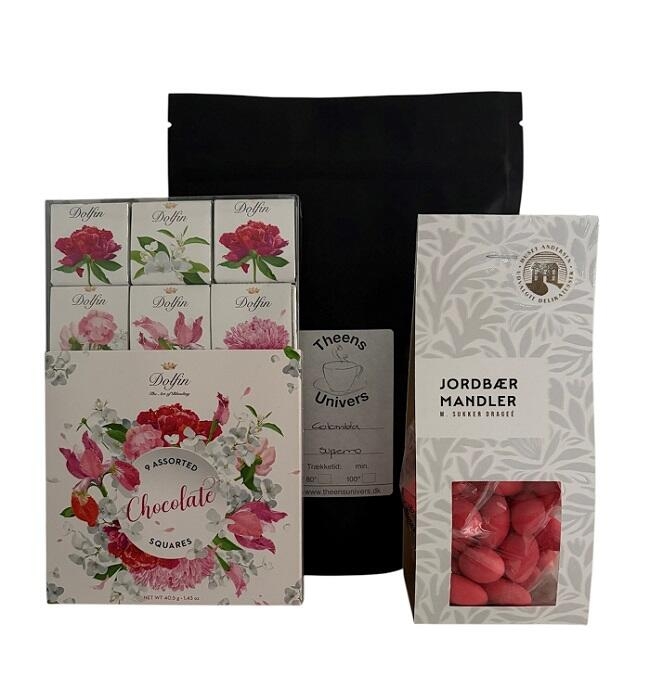 Skøn gavepakke med 200 gram Colombia Supremo hele bønner, 100 gram jordbærmandler og 40 gram i alt 9 stykker chokolade fra Belgien. I chokoladen finder du bla. mørk m/orange, mørk m/nougatine og lys 37%.