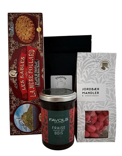 Lækker gavepakke med100 gram Æble Kvæde The (sort the m/kvæde), 100 gram jordbærmandler, 250 gram Skovjordbær Marmelade fra Frankrig og 125 gram Franske småkager m/chokoladestykker.